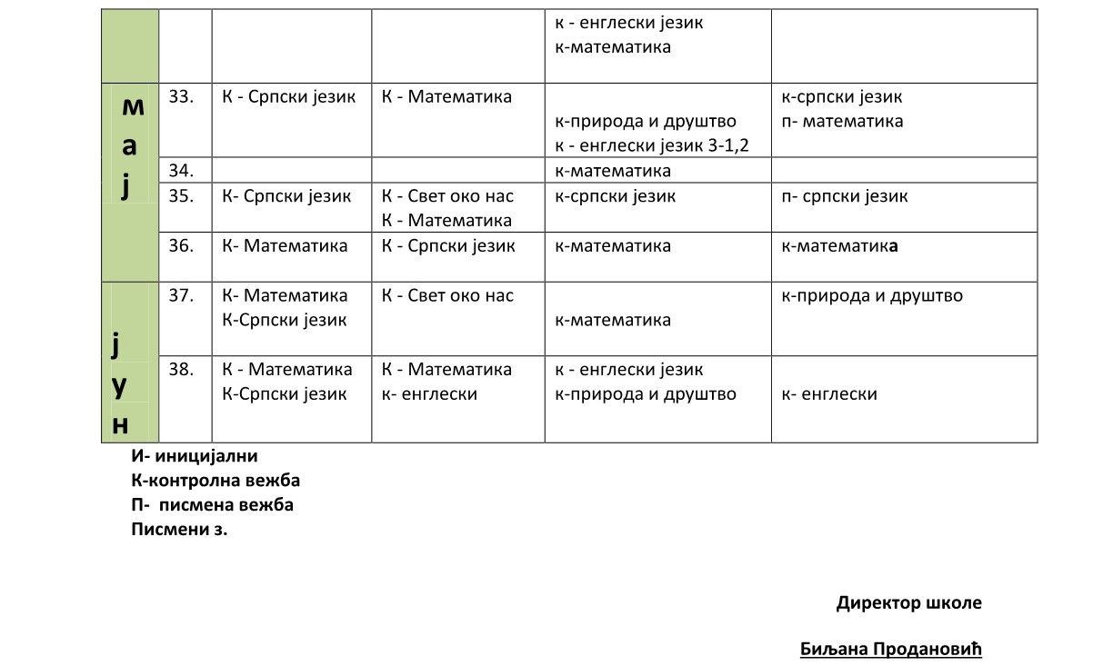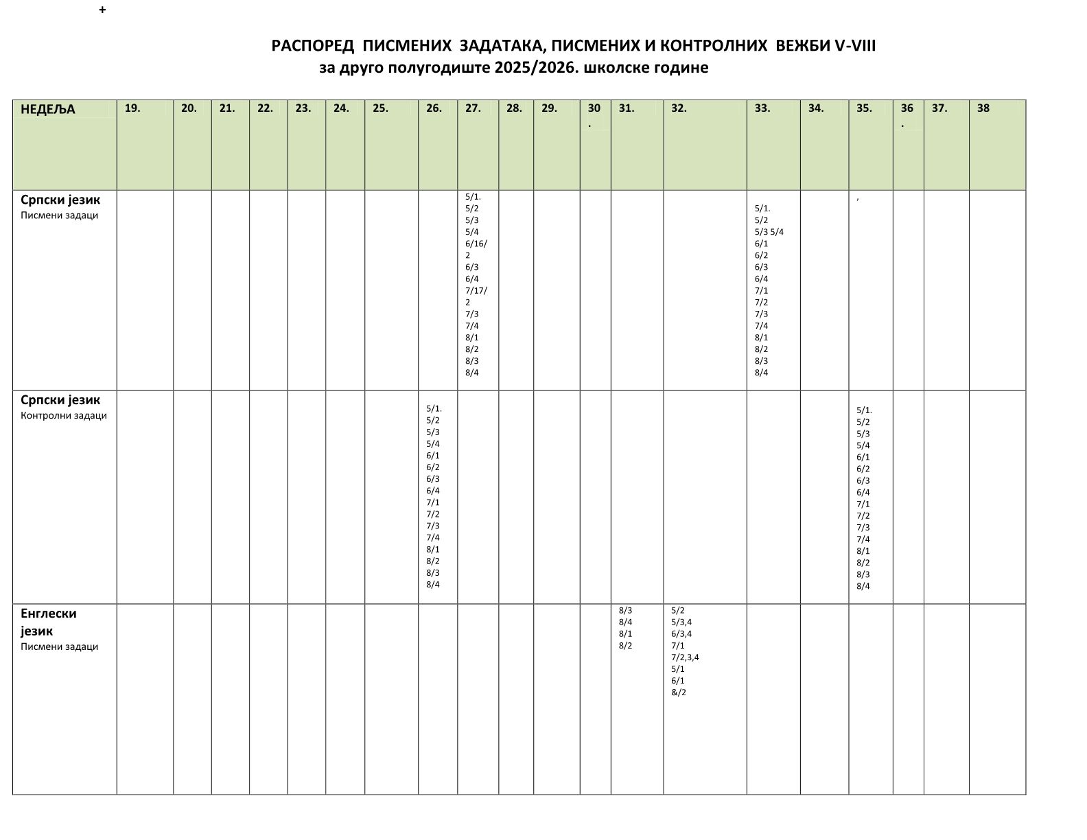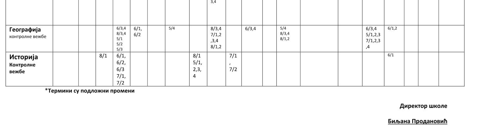 Распоред писмених задатака и контролних вежби за  друго полугодиште 2025 / 2026. школске године