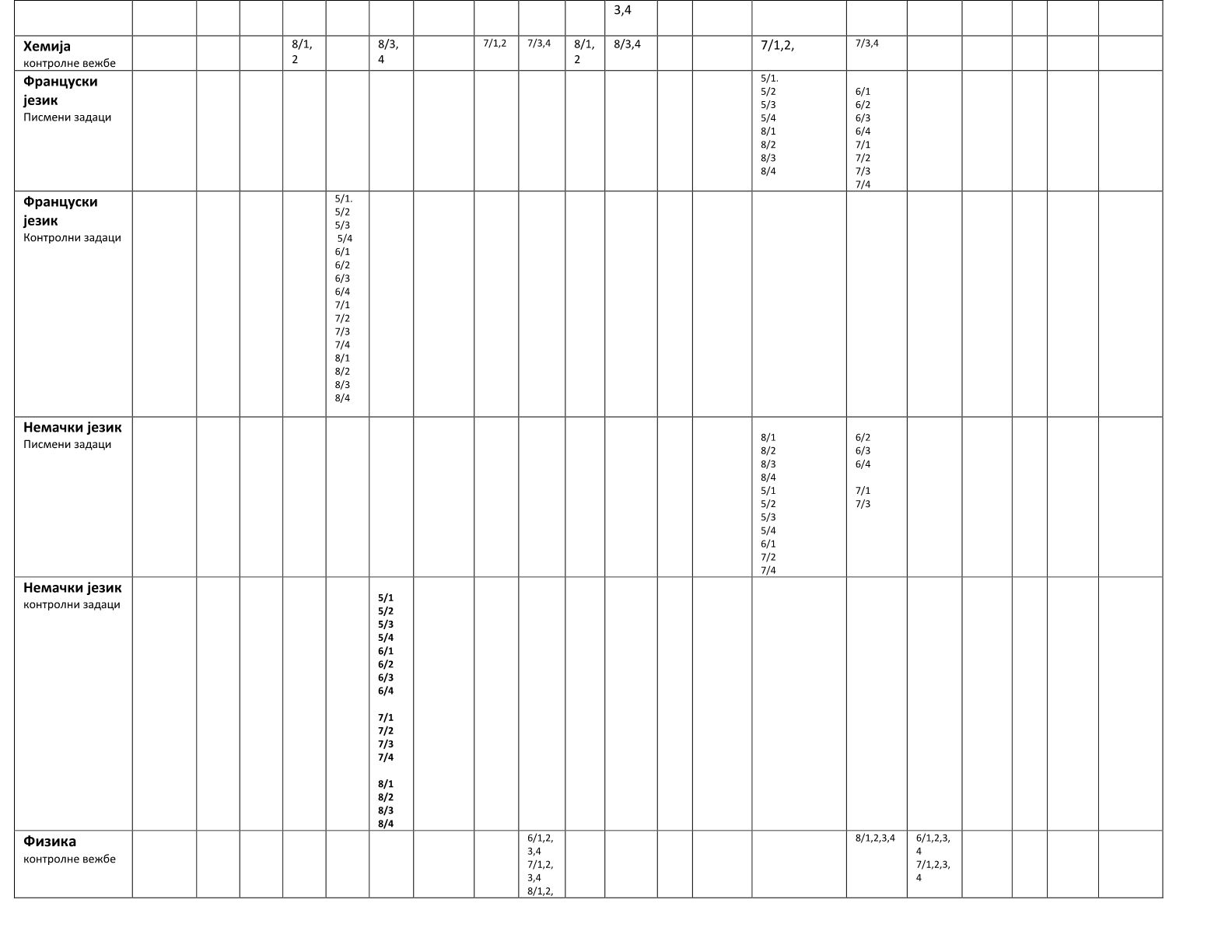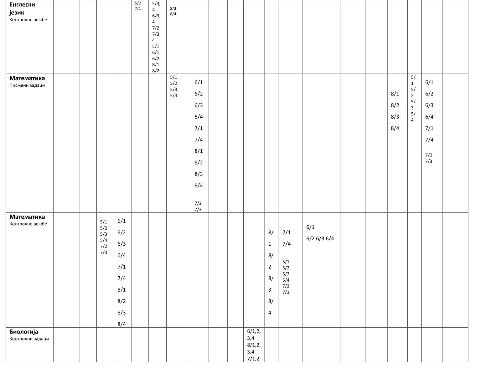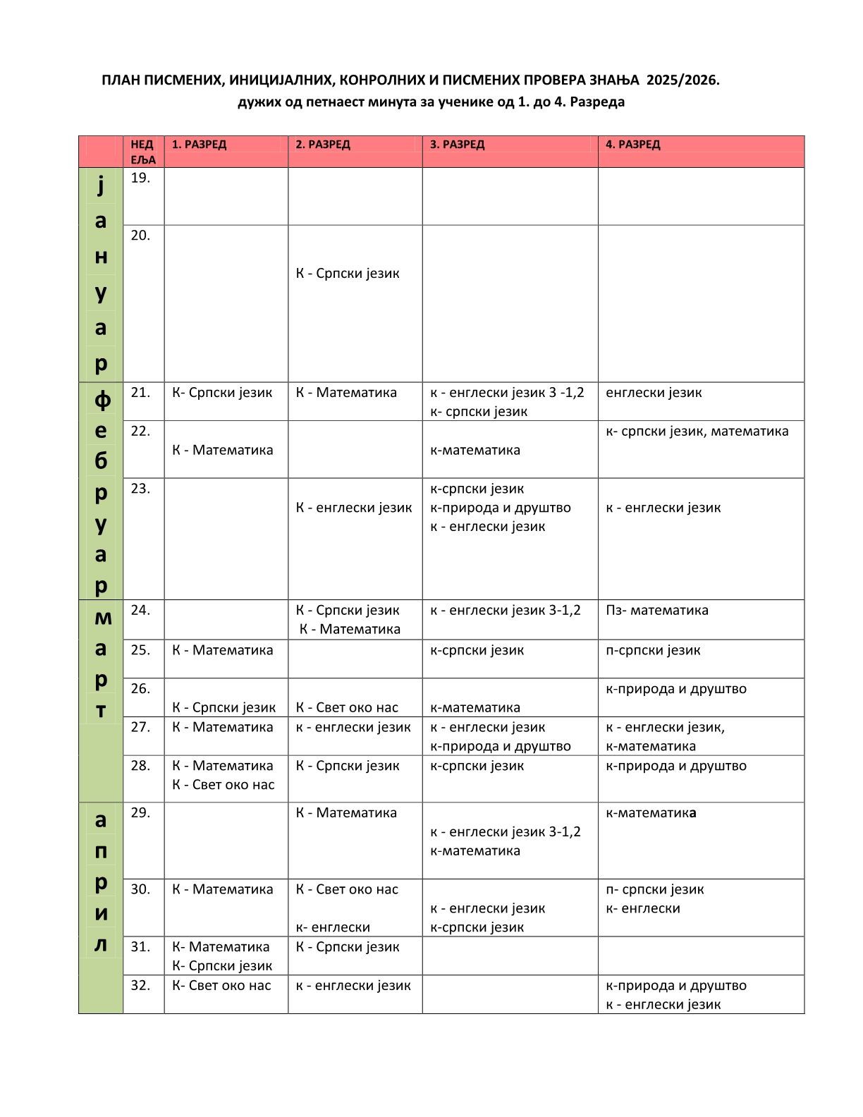 Распоред писмених задатака и контролних вежби за  друго полугодиште 2025 / 2026. школске године