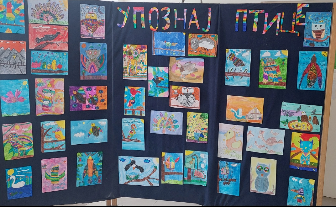 У холу школе изложени су ученички радови млађих разреда са школског такмичења на тему "Упознајмо птице"