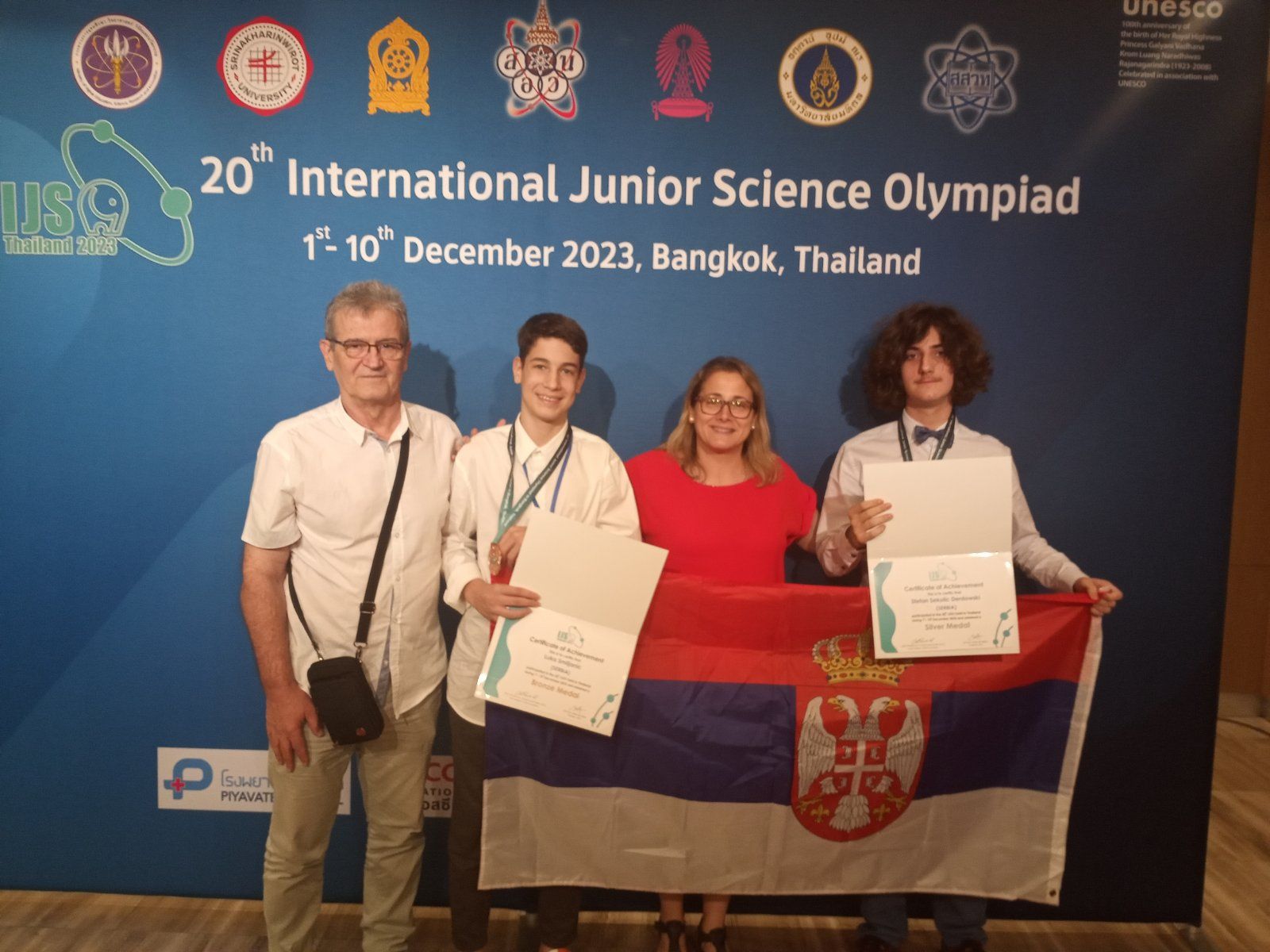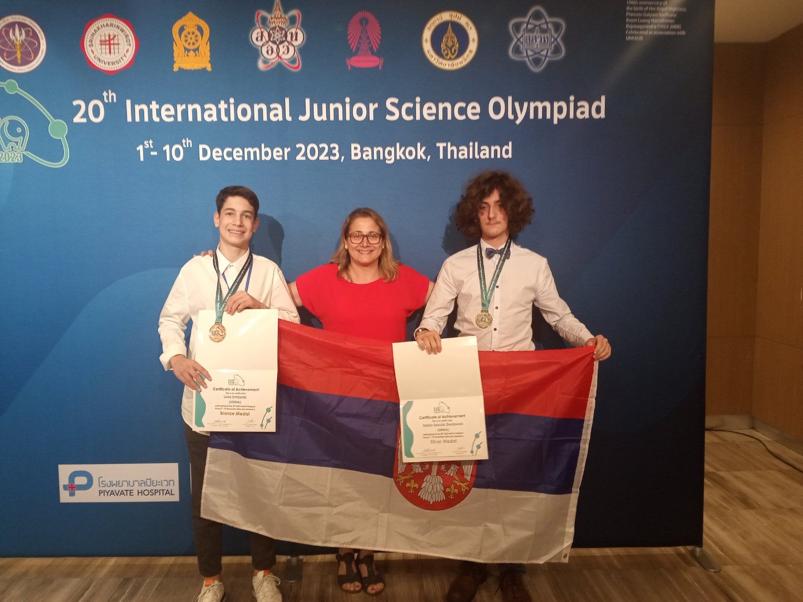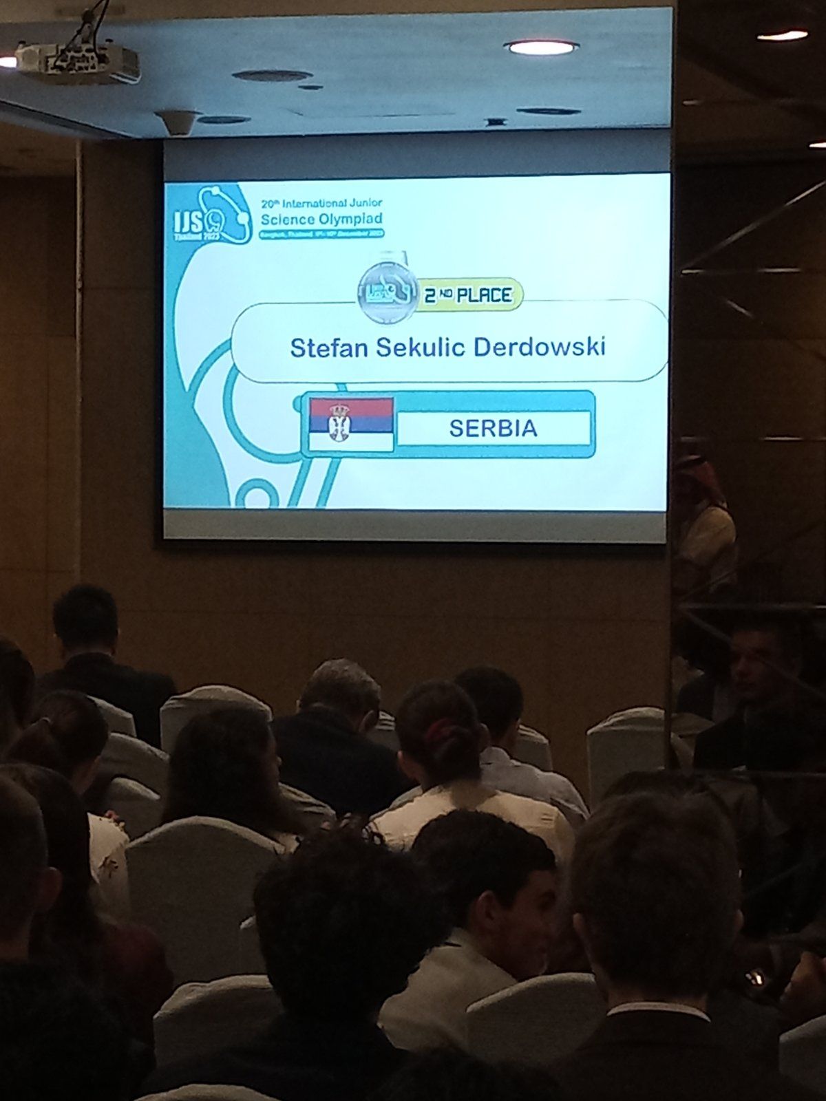 Стефан Секулић Дердовски, Лука Смиљанић и њихова наставница Маја Мутић су били део тима који је Србију представљао на Интернационалној јуниорској научној олимпијади која је одржана од 1.12. до 10.12.2023. у Бангкоку на Тајланду. Вредни и талентовани „Душковци „ ( сада ученици Математичке гимназије ) су након школског, општинског, градског и државног такмичења, у претходној школској години, освојили и највише позиције на Српској физичкој олимпијади, одржаној 11. и 12.5. 2023. и на Изборном такмичењу, одржаном 29.9.2023., што их је квалификовало за учешће на Олимпијади на Тајланду. Такмичење је изузетно захтевно јер се одвија у три сегмента, са даном паузе између сегмената. Ученици први дан такмичења раде рачунске задатке, онда је дан за решавање теоријских проблема и последњи дан је израда експерименталних задатака. На Олимпијади су учествовали ученици из 60 држава ( 5 или 6 најбољих ученика представља своју државу ) и у таквој конкуренцији Стефан Секулић Дердовски је освојио сребрну а Лука Смиљанић бронзану медаљу.