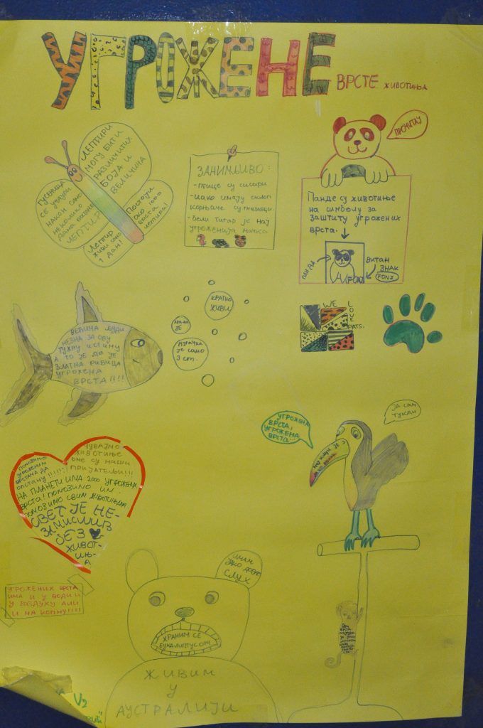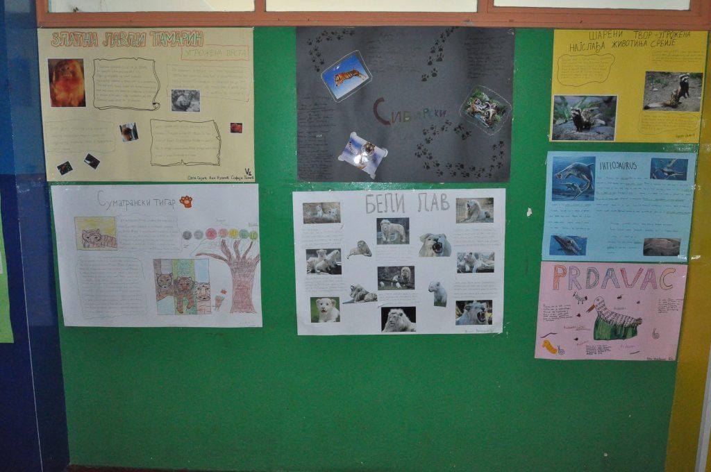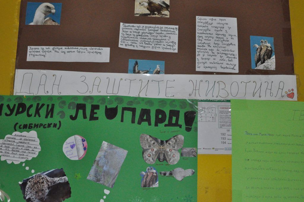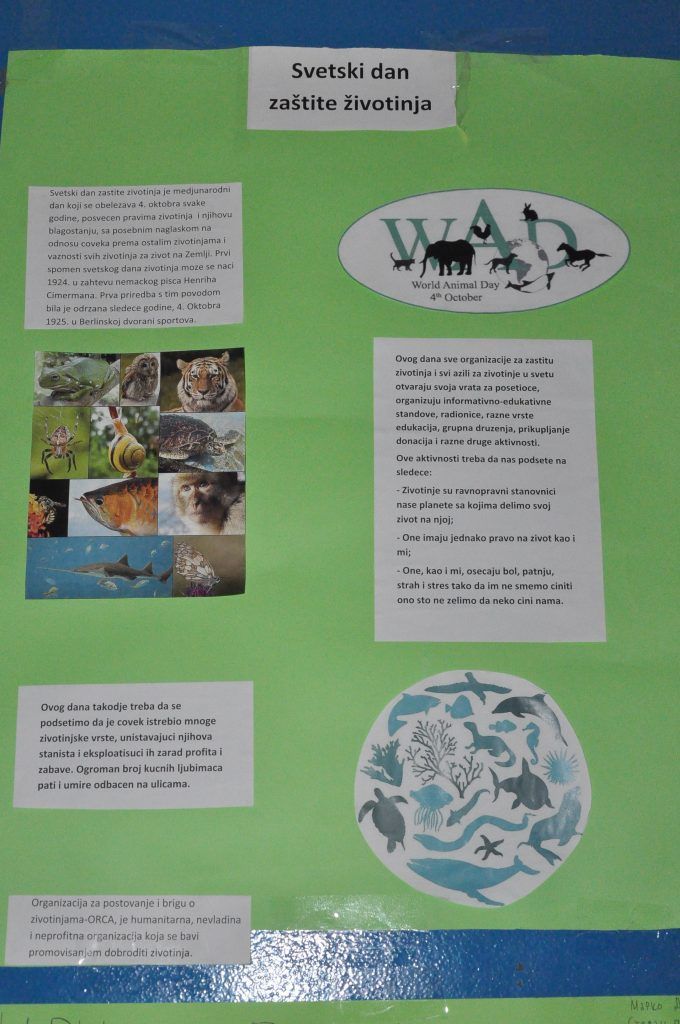 Поводом Светског дана заштите животиња, 4. октобра, у нашој школи организована је изложба ученичких радова. Ученици су својом маштовитошћу и ликовним умећем успели да изразе своју љубав према животињама, као и своју забринутост за њихов опстанак. Позивамо Вас да посетите нашу изложбу и научите како да помогнете животињама. Оно најважније је свакако љубав!