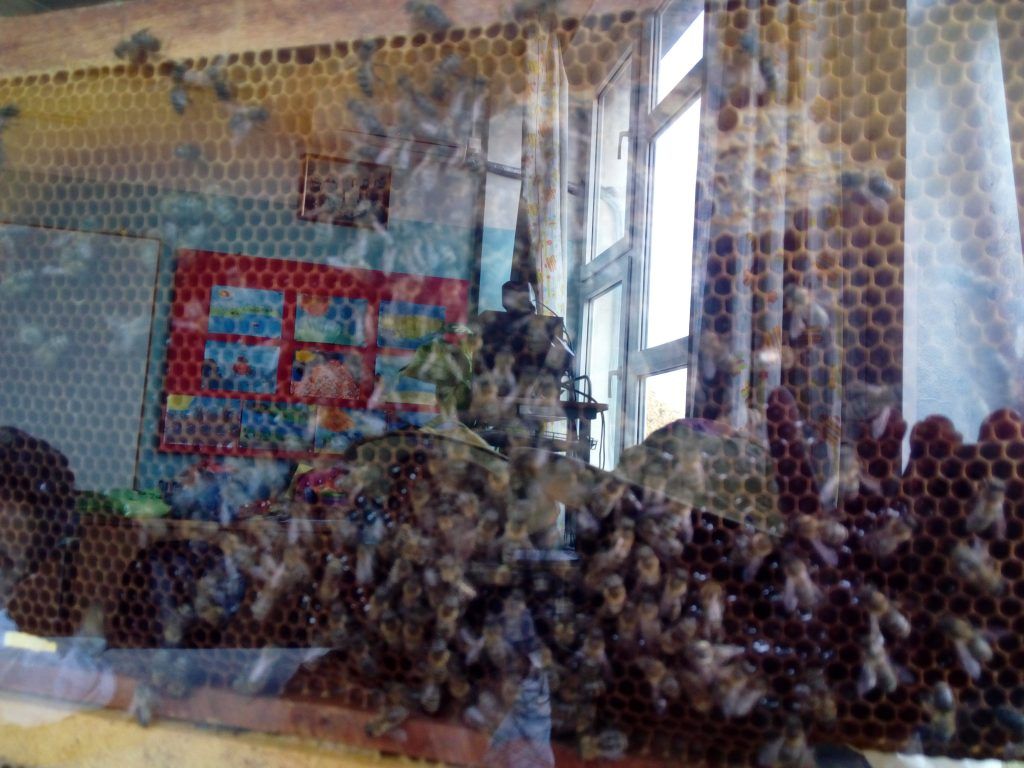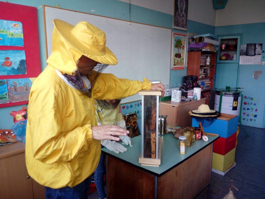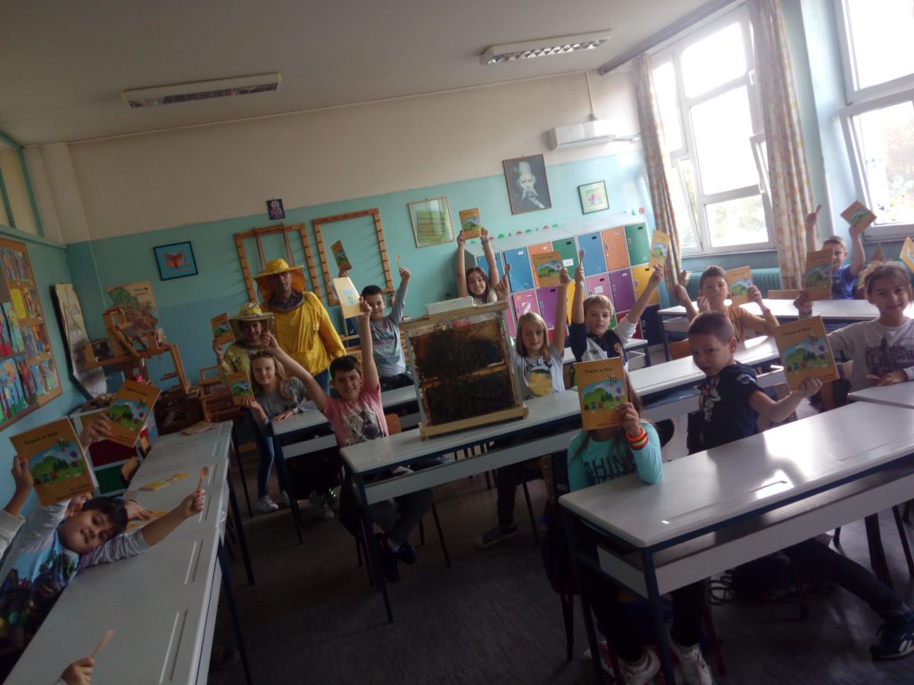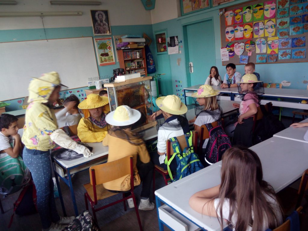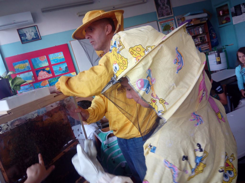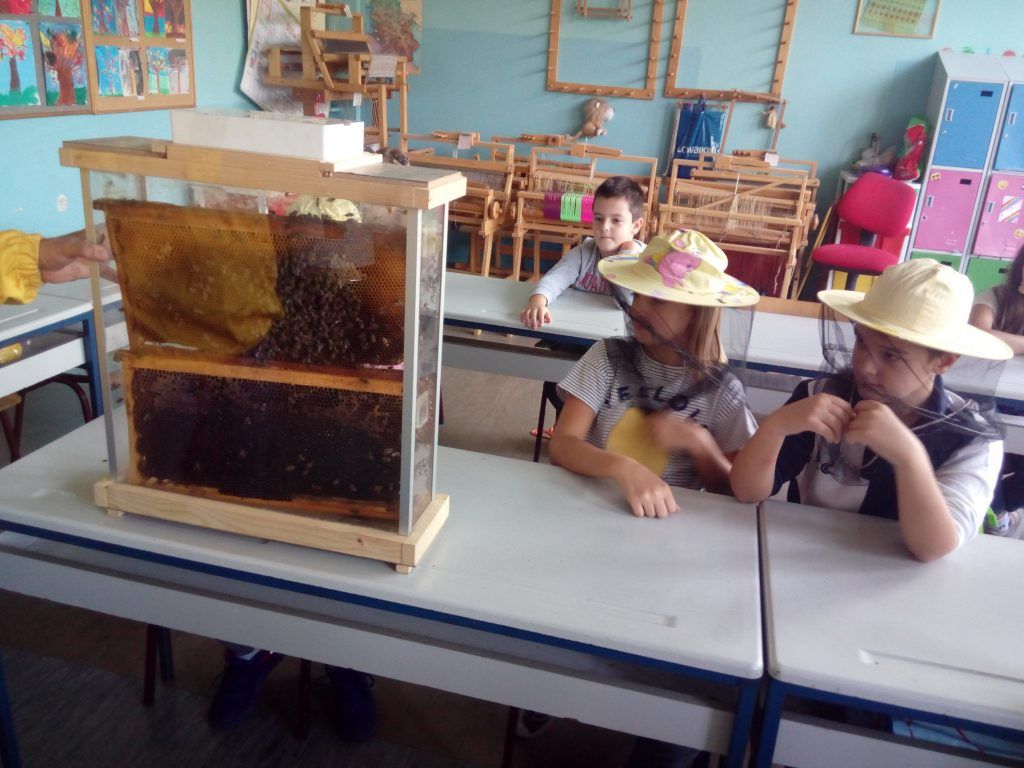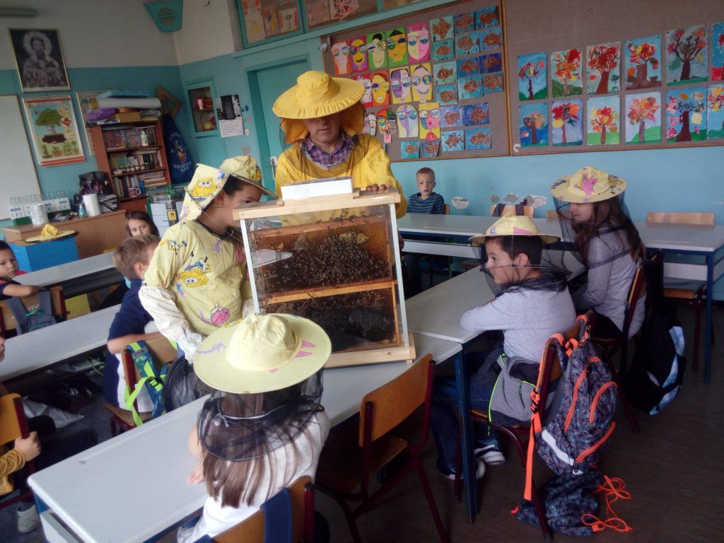 Пре две недеље неки од ђака наше школе имали су блиски сусрет са живом пчелињом заједницом. Пчелар је дошао и донео експерименталну кошницу у којој се налазе матица, трутови и пчеле радилице. Деца су добила информације о пчелама, пчеларству, пчелињим производима и видела комплетан пчеларски прибор. Свако је добио књижицу Пчеле и мед и дрвену кашичицу. Погледајте фотографије, оне говоре више од речи о томе како је протекао тај несвакидашњи сусрет.