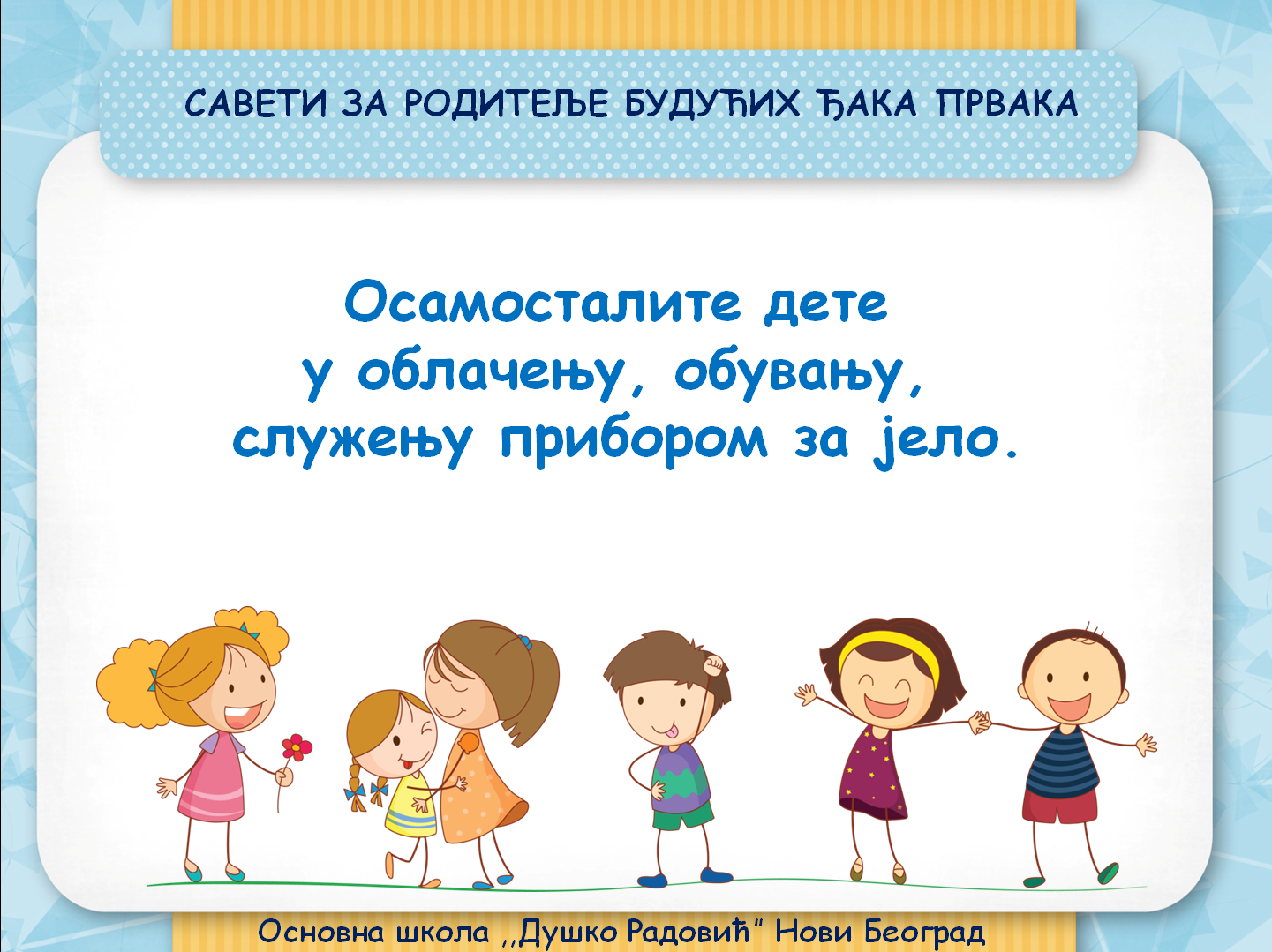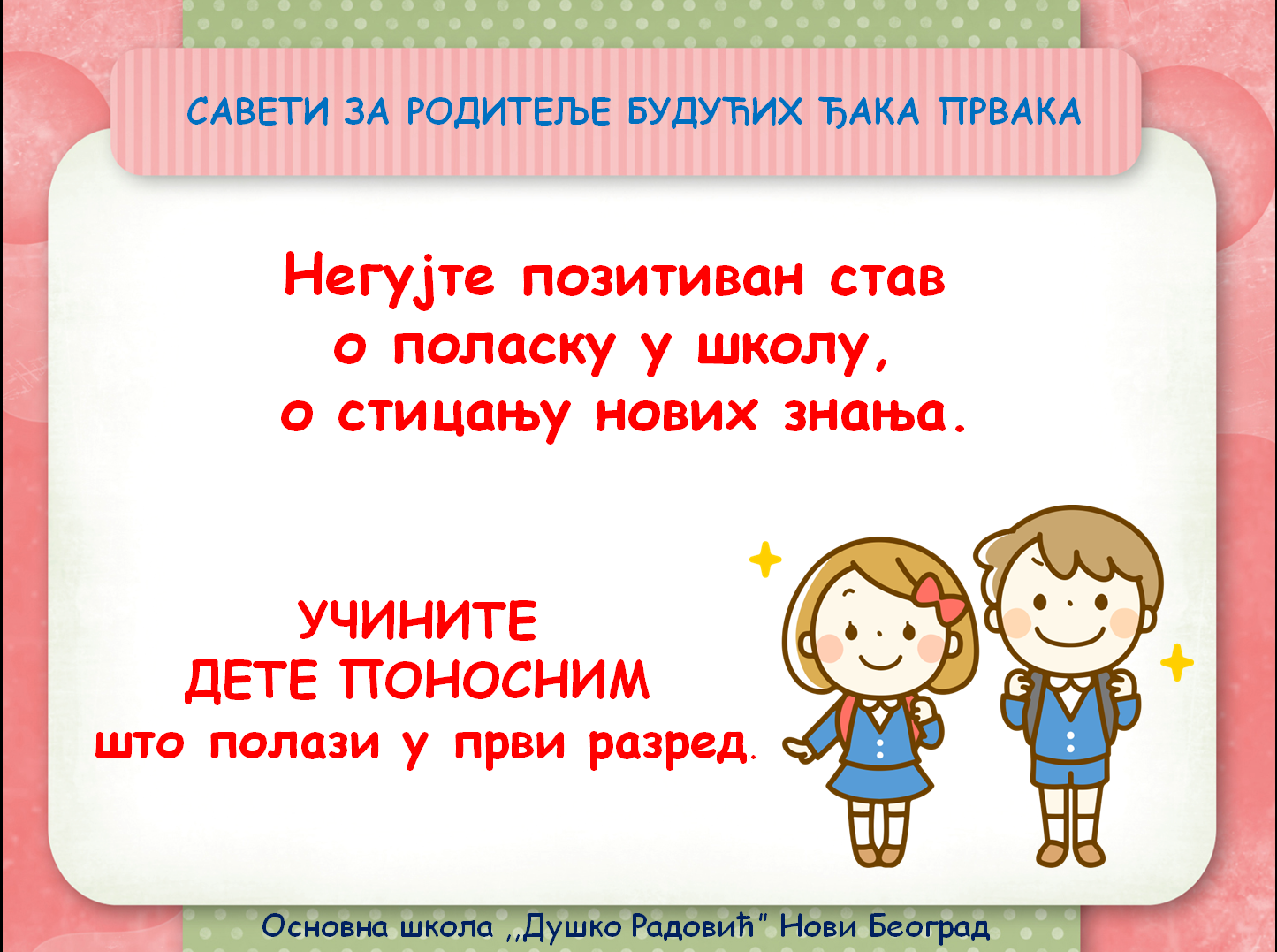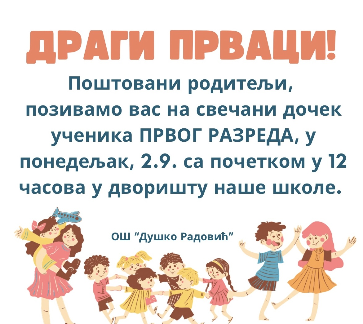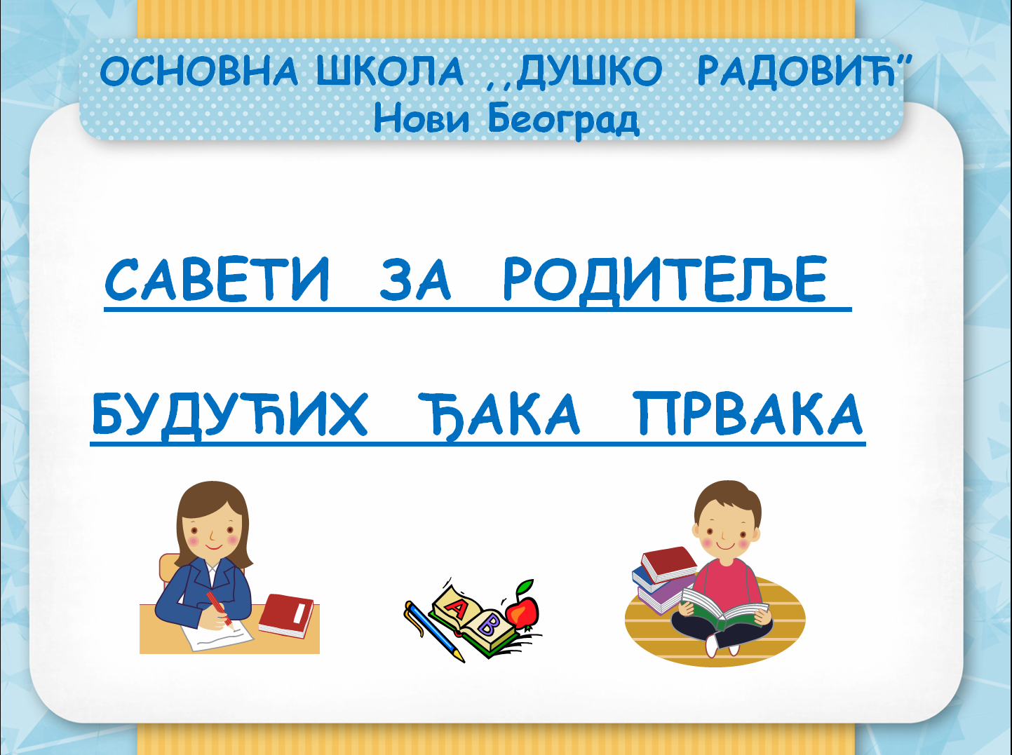 Школа „Душко Радовић“ је направљена 1961. године. Тадашњи ђаци прваци, који су у њу кренули, данас имају 66 година. Можда су у њу ишле ваше баке, деке или родитељи. Наша школа је после 60 година сада поново потпуно нова, а нови ђаци прваци сте баш ви. Све у школи је ново и лепо и потруди се да је чуваш, како би што дуже остала лепа и другима који ће доћи после тебе. У школи ћеш многа знања стећи са радошћу, кроз игру са својим другарима. Ипак, неће ти увек бити лако да се све научиш. Потруди се да заволиш сазнање. Видећеш да је лепо учити и сазнавати нове ствари иако је некада тешко. Једна народна изрека каже „без муке нема науке!“. Као што понекад паднемо кад учимо да возимо бицикл па нас боли и лоше се осећамо... на крају, кад научимо буде нам лепо и уживамо у вожњи. Тако и у школи неће бити баш све лако да се научи, али кад научиш, бићеш срећан што знаш, а добићеш и петицу па ће тако и твоји родитeљи сазнати да си нешто ново, лепо научио. Много су чешће лаке и лепе ствари али је важно да знаш да није све лако, да би се што боље припремио. Научи да правилно држиш оловку, то је важно да ти се ручица не би пребрзо умарала. Када лоше поставиш прстиће рука се мучи па не може дуго у том положају да издржи, а у школи има пуно да се пише. Дешава се ђацима да им се рука умори па је одмарају док друга деца пишу и тако онда не стигну све да запишу. Научи пре школе и да вежеш пертле. Важно је да можеш сам да их вежеш. Није безбедно да се хода одвезаних пертли а на путу до учитељице или неког другог ко би ти их везао, многа деца се често саплету и падну.