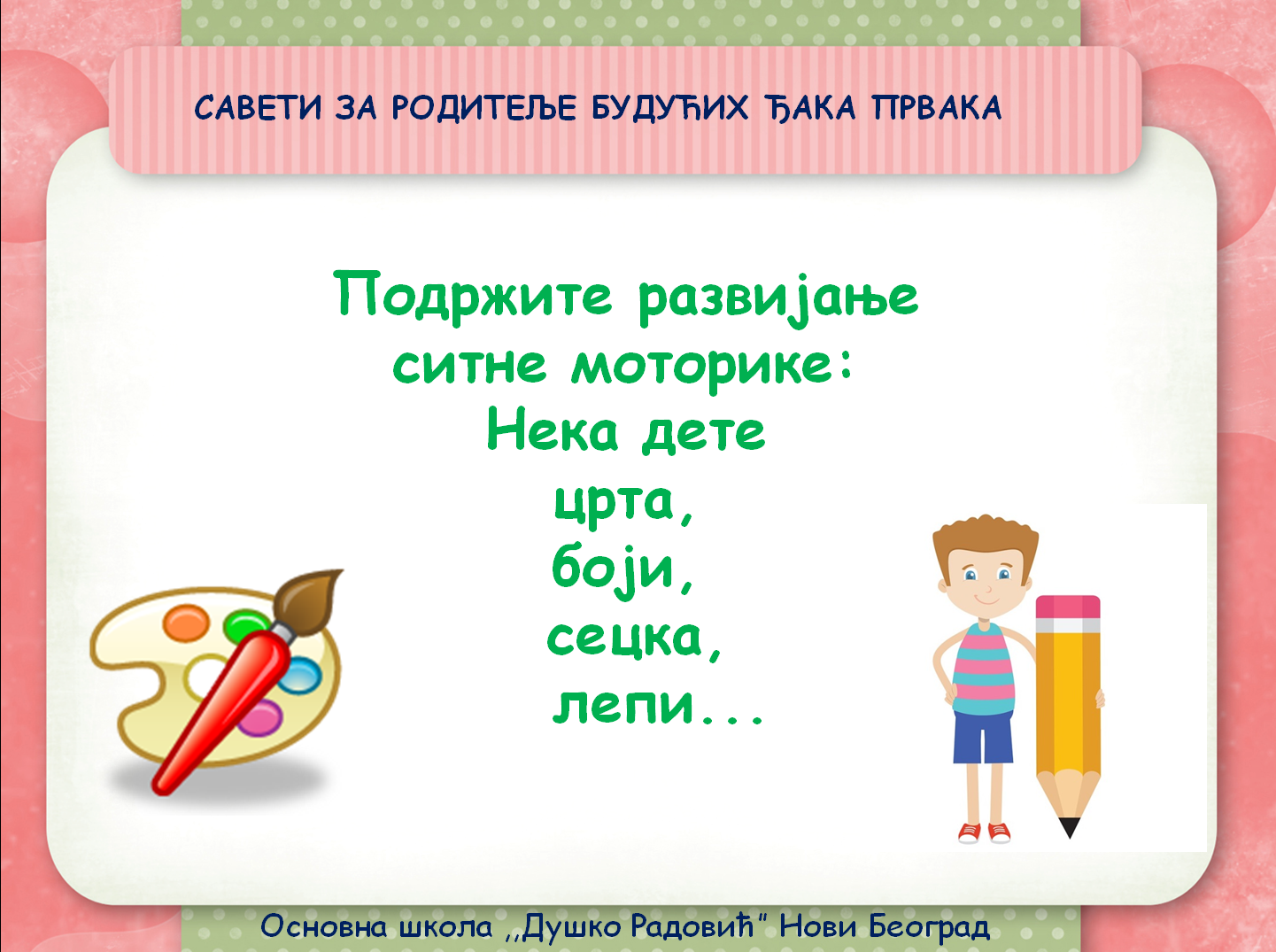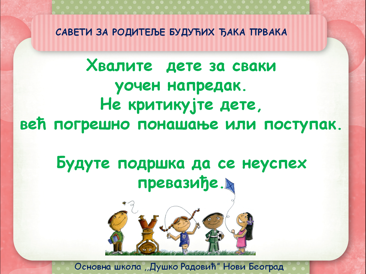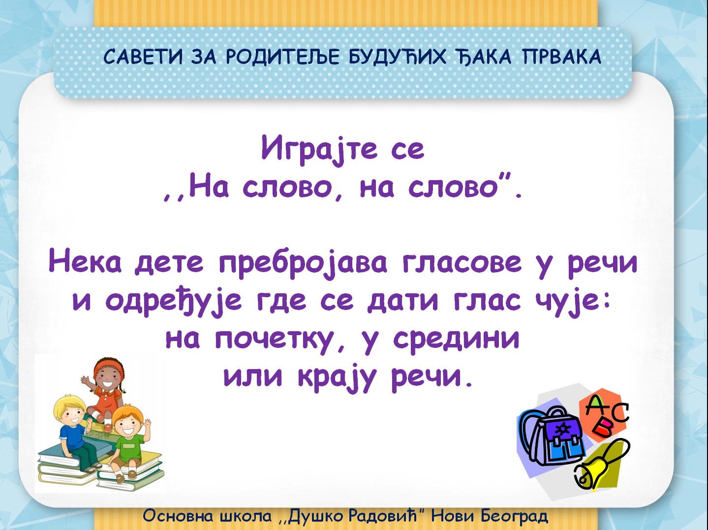 Школа „Душко Радовић“ је направљена 1961. године. Тадашњи ђаци прваци, који су у њу кренули, данас имају 66 година. Можда су у њу ишле ваше баке, деке или родитељи. Наша школа је после 60 година сада поново потпуно нова, а нови ђаци прваци сте баш ви. Све у школи је ново и лепо и потруди се да је чуваш, како би што дуже остала лепа и другима који ће доћи после тебе. У школи ћеш многа знања стећи са радошћу, кроз игру са својим другарима. Ипак, неће ти увек бити лако да се све научиш. Потруди се да заволиш сазнање. Видећеш да је лепо учити и сазнавати нове ствари иако је некада тешко. Једна народна изрека каже „без муке нема науке!“. Као што понекад паднемо кад учимо да возимо бицикл па нас боли и лоше се осећамо... на крају, кад научимо буде нам лепо и уживамо у вожњи. Тако и у школи неће бити баш све лако да се научи, али кад научиш, бићеш срећан што знаш, а добићеш и петицу па ће тако и твоји родитeљи сазнати да си нешто ново, лепо научио. Много су чешће лаке и лепе ствари али је важно да знаш да није све лако, да би се што боље припремио. Научи да правилно држиш оловку, то је важно да ти се ручица не би пребрзо умарала. Када лоше поставиш прстиће рука се мучи па не може дуго у том положају да издржи, а у школи има пуно да се пише. Дешава се ђацима да им се рука умори па је одмарају док друга деца пишу и тако онда не стигну све да запишу. Научи пре школе и да вежеш пертле. Важно је да можеш сам да их вежеш. Није безбедно да се хода одвезаних пертли а на путу до учитељице или неког другог ко би ти их везао, многа деца се често саплету и падну.