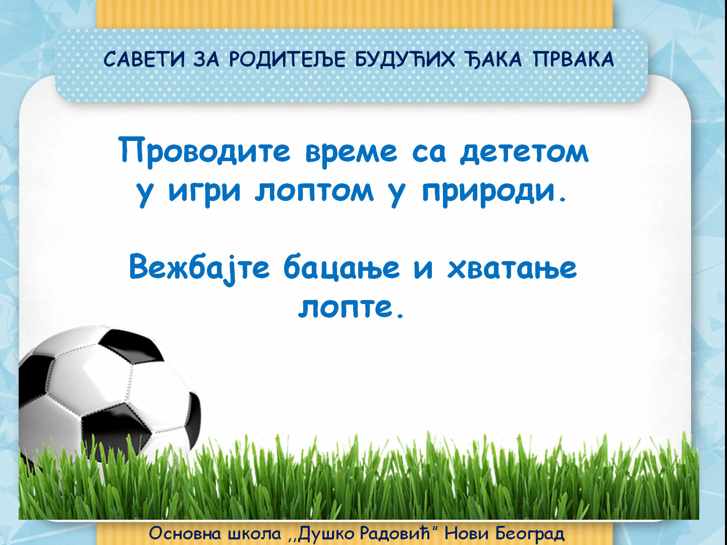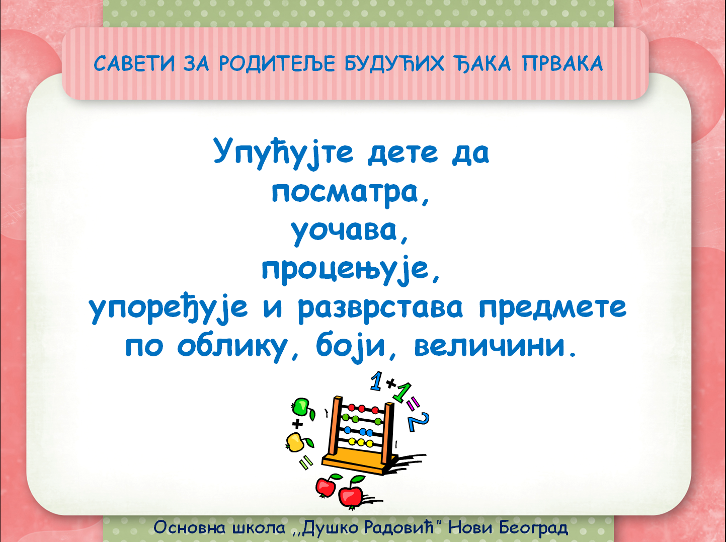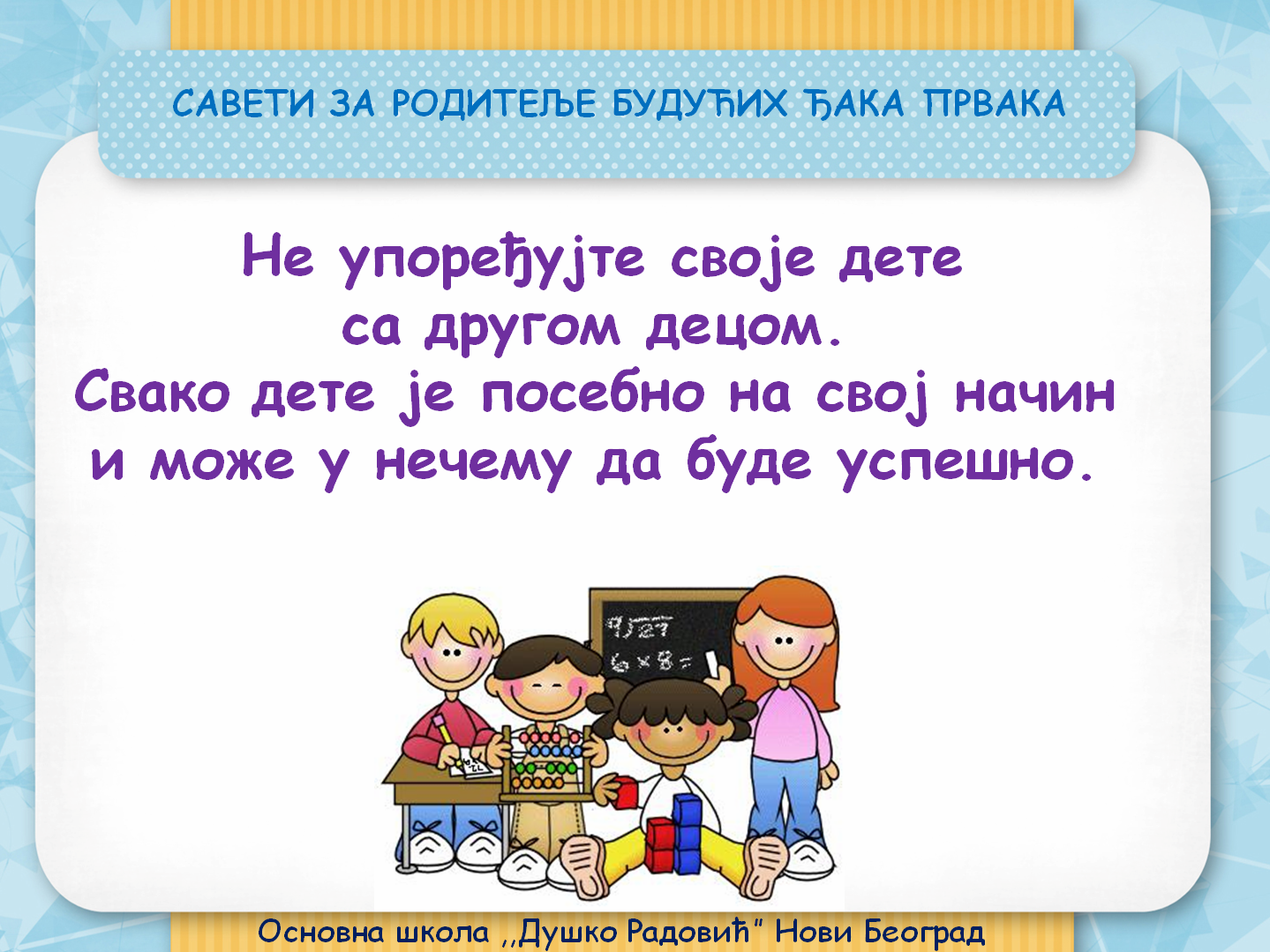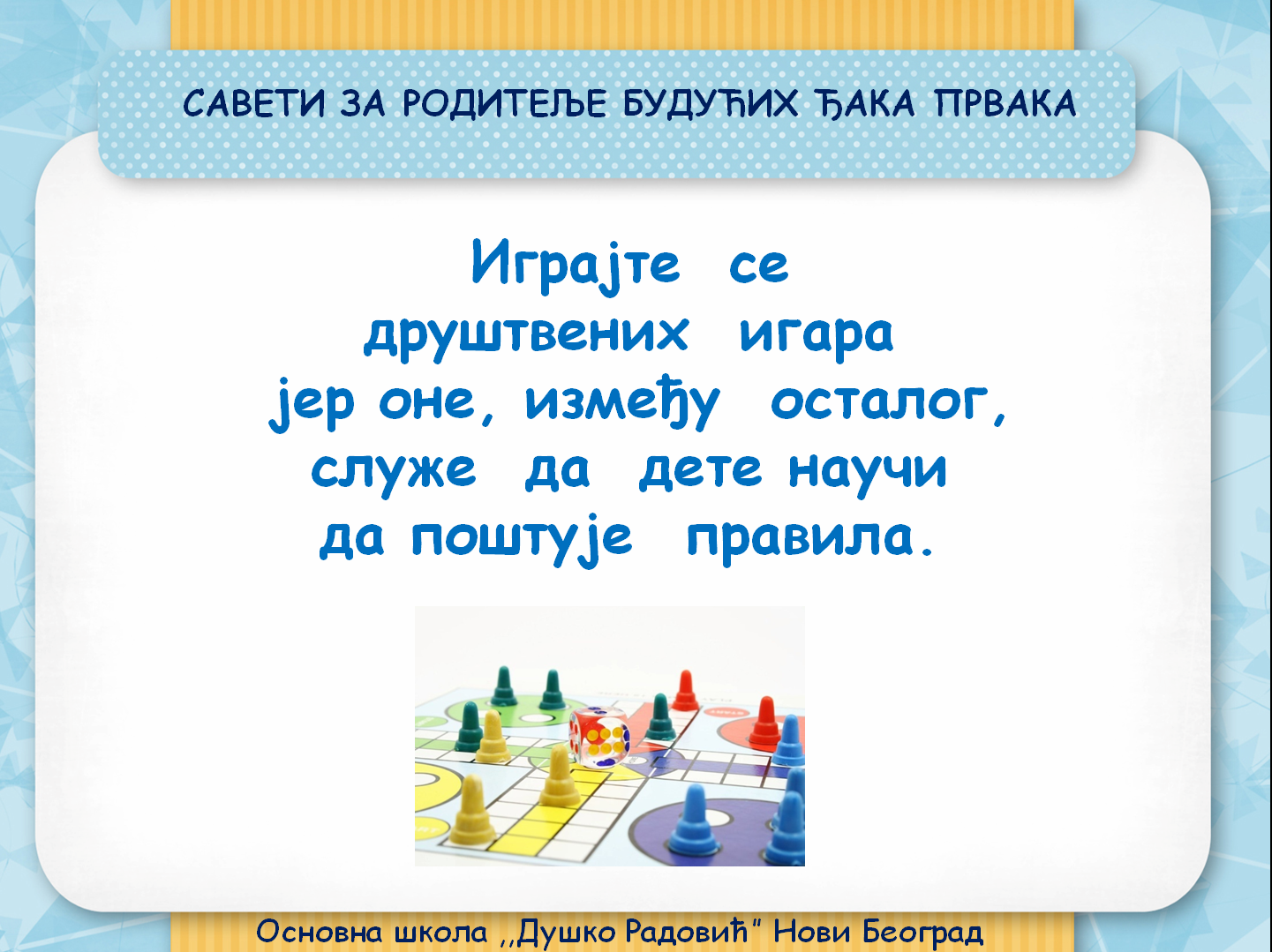 Школа „Душко Радовић“ је направљена 1961. године. Тадашњи ђаци прваци, који су у њу кренули, данас имају 66 година. Можда су у њу ишле ваше баке, деке или родитељи. Наша школа је после 60 година сада поново потпуно нова, а нови ђаци прваци сте баш ви. Све у школи је ново и лепо и потруди се да је чуваш, како би што дуже остала лепа и другима који ће доћи после тебе. У школи ћеш многа знања стећи са радошћу, кроз игру са својим другарима. Ипак, неће ти увек бити лако да се све научиш. Потруди се да заволиш сазнање. Видећеш да је лепо учити и сазнавати нове ствари иако је некада тешко. Једна народна изрека каже „без муке нема науке!“. Као што понекад паднемо кад учимо да возимо бицикл па нас боли и лоше се осећамо... на крају, кад научимо буде нам лепо и уживамо у вожњи. Тако и у школи неће бити баш све лако да се научи, али кад научиш, бићеш срећан што знаш, а добићеш и петицу па ће тако и твоји родитeљи сазнати да си нешто ново, лепо научио. Много су чешће лаке и лепе ствари али је важно да знаш да није све лако, да би се што боље припремио. Научи да правилно држиш оловку, то је важно да ти се ручица не би пребрзо умарала. Када лоше поставиш прстиће рука се мучи па не може дуго у том положају да издржи, а у школи има пуно да се пише. Дешава се ђацима да им се рука умори па је одмарају док друга деца пишу и тако онда не стигну све да запишу. Научи пре школе и да вежеш пертле. Важно је да можеш сам да их вежеш. Није безбедно да се хода одвезаних пертли а на путу до учитељице или неког другог ко би ти их везао, многа деца се често саплету и падну.