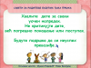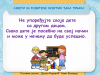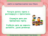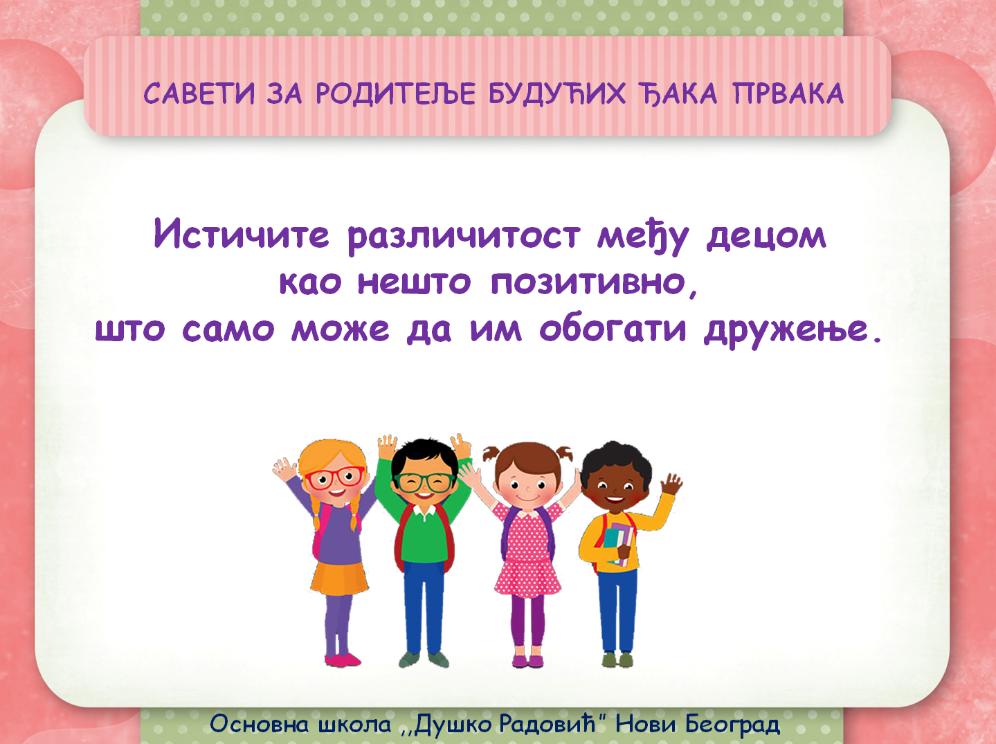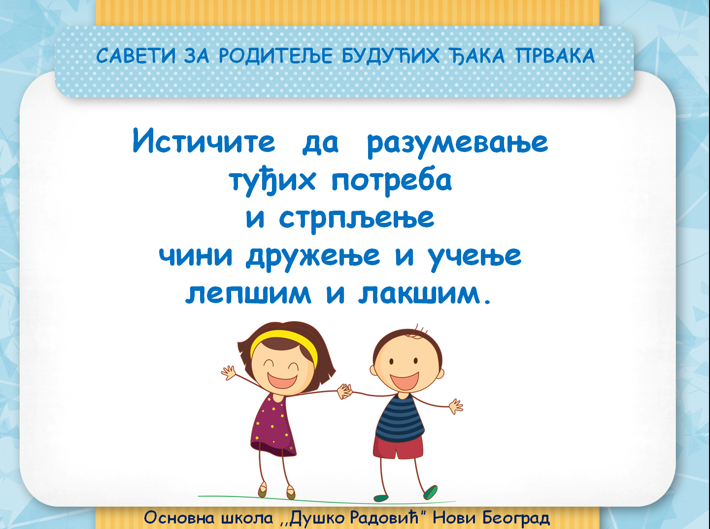 Добићеш школску торбу, пуно књига и лепих свесака, оловке и много тога. Твој задатак ће бити да свакога дана пакујеш своју торбу. Ти си ђак а мама и тата су твоји помоћници у паковању. Научићеш да бринеш о својим стварима у школи, да сам дођеш до школе, да сам радиш домаће задатке и још мноооого тога. Путоваћеш са својим другарима на многа лепа места, одлазићете на разне излете. Открићеш много нових игара и бићеш срећан због тога. Важно је да будеш добар друг свим својим другарима. Да сваког свог друга уважаваш. То значи да сваког прихваташ и да се трудиш да их саслушаш ако нешто причају. Ако будеш према свима пажљив, другарима ће бити пријатно у твом друштву и биће вам свима добро. Свако од твојих другара је другачији од тебе и нико не воли баш све што ти волиш, нити зна све што ти знаш. Важно је да знаш да они вероватно нешто друго знају боље од тебе а нешто лошије од тебе. Ако желиш, можеш нешто ново научити неког ко то не зна, али немој задиркивати неког ко не зна. Тако исто и ти можеш научити неку вештину од свог друга и постати успешнији него што си био. Лепо је кад другари размењују своја знања. Ако буде другара који се грубо понашају према теби и због којих се лоше осећаш, реци им да ти смета њихово понашање. Ако наставе да се лоше понашају то мораш пријавити учитељици и својим родитељима да би ти неко помогао. У школи је важно да слушаш учитељицу као што код куће слушаш родитеље. Учитељица ће те саслушати, разумети и помоћи ће ти у свему. Школа је лепа и лепо је што ћеш своја знања стицати заједно са својим другарима уз помоћ учитељице.